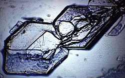 A gauche, un cristal d' acide tartrique ( x25 ) en lumière normale;