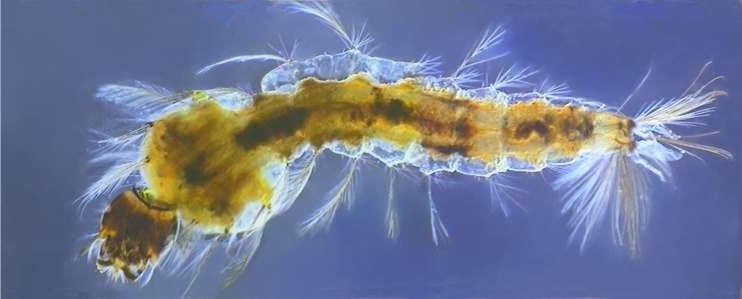 Larve de moustique Anophèles. Photographiée en 3 fois avec l'objectif 4 x et le diaphragme COL-D2 . Re-composée avec Photopaint. puis réduite de 1489 x 593 px à 750 x 299 |