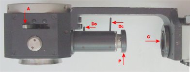 La lumière venant de la source passe au travers du corps du microscope. Un levier permet de décentrer le collecteur. |