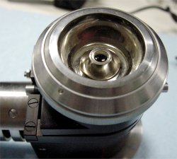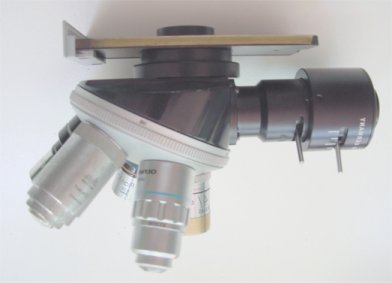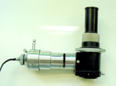 Cet illuminateur BBT se monte grâce à une bague filetée à la place du revolver du microscope. |