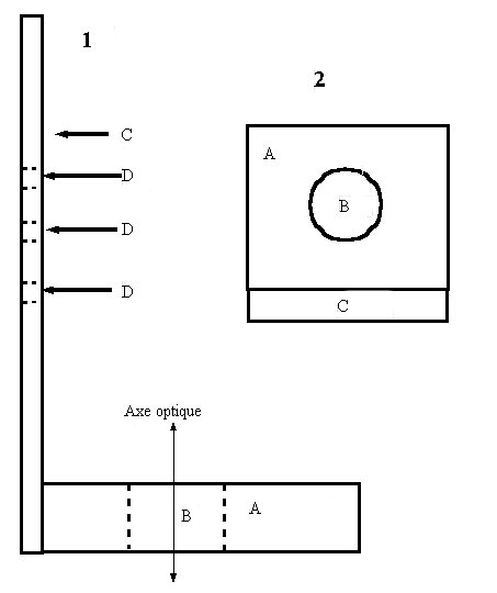 A - partie horizontale en bois de 20mm d'épaisseur, percé d'un trou B, au diamètre du tube du microscope. C - partie verticale en bois de 8mm d'épaisseur, percée de trous (D) permettant de fixer la caméra à diverses hauteurs. La série de trous peut être remplacée par une ouverture allongée, donnant encore plus de souplesse dans le positionnement de la caméra. A et C sont collées et la fixation est renforcée par 3 ou 4 pointes sans tête. Il est très important que l'axe