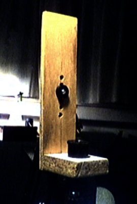 | L'adaptateur en place sur le tube du microscope. La partie horizontale, en bois relativement épais assure le maintient de l'ensemble. La partie verticale sert à la fixation de la caméra par l'intermédiaire d'une vis . Il y a plusieurs trous pour faire varier la distance entre l'oculaire du microscope et la caméra. |
