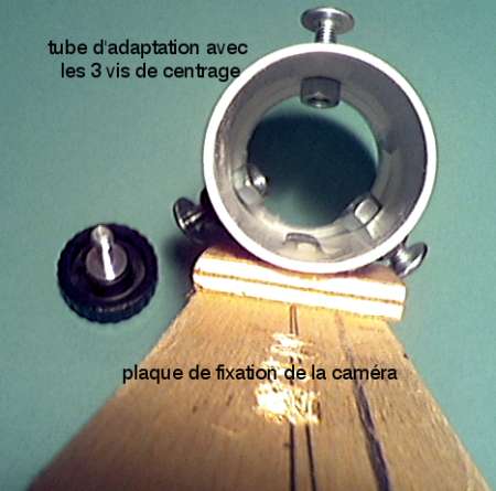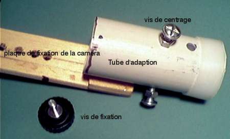 La première étape de l'installation est de réaliser un adaptateur de la caméra. C'est une pièce en forme "L" que nous avons faite en bois, mais elle peut très bien être réalisée en métal, au prix de quelques adaptations, notamment au niveau de la fixation sur le tube du microscope.