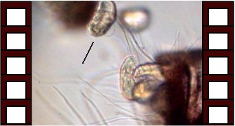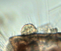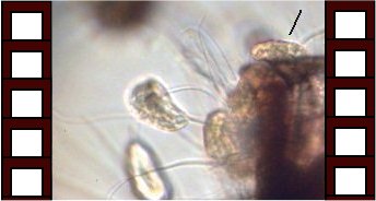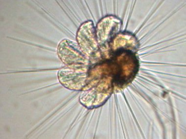Cette sorte de fleur est l'adulte (partie sombre) et ses 'pétales' sont les jeunes larves qui sont prêtes à prendre leurs envol. Sur la vue en temps réel leurs cils commençaient à battre régulièrement. Objectif x 15 |
