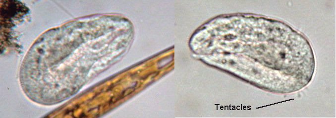 | Les larves ressemblent beaucoup à des ciliés (puisqu'elles en sont ! ) mais elles se déplacent nettement plus lentement et sur de courtes distances. Si je n'avais pas vu leur naissance je les aurais prises pour des ciliés un peu ralentis ! Voir images ci dessous au x 40 . Sur celle de droite on distingue déjà une ébauche de tentacules et une sorte de structure repliée. Comme on va le voir ces larves ont une brève existence sous cette forme : lorsqu'elles trouvent un support à leur goût (sur quels critères de choix ??) elles se fixent perdent leurs cils et se métamorphosent immédiatement en adultes. |