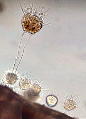 | Le processus de reproduction est en effet assez étrange mais très captivant : la génération des larves se fait par bourgeonnement de l'individu adulte. On peut voir les cils qui commencent à s'agiter alors qu'elles sont encore fixées, puis elles se séparent en cherchant un support. Rassurez vous, elles n'ont pas la vitesse de déplacement des protozoaires excités que nous connaissons et laissent le temps de les suivre. | ||