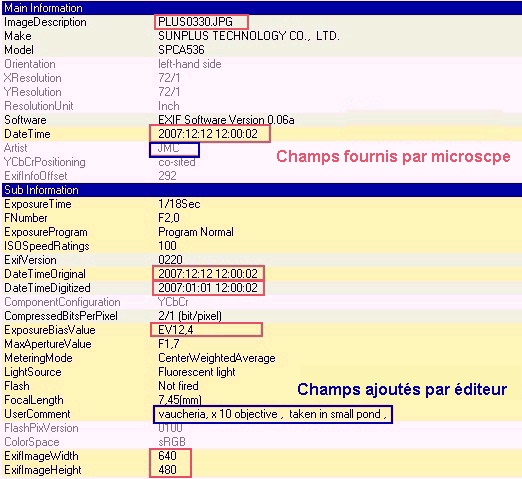 Note : Un fichier EXIF est généré dans les images ; en rouge valeurs fournies par le microscope (y compris numérotation auto des images : taille image, date, exposition... Avec un éditeur EXIF il est possible de renseigner (en bleu) d'autres champs : commentaires, auteur... pour documenter vos images |