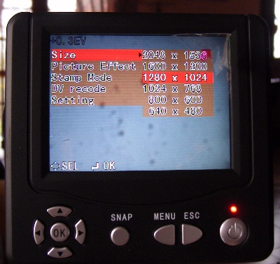 - Taille d'image , 6 tailles (en fait 1600 x 1200 est le meilleur compromis pour utiliser au mieux les 2 Mpixels et offre plus de 500 images en mémoire)