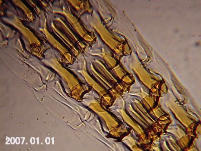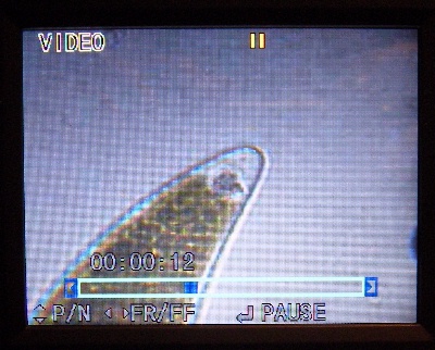 Autres fonctions : zoom avec facteur de 1 à 4 fois (en fait il vaut mieux ne pas dépasser 2 fois ce qui donne des grossissements intermédiaires de 40 à 80 ... 100 à 200 et 400 à 800 ! ) en utilisant les flèches gauche et droite du bouton de navigation; les flèches haut et bas règlent l'éclairage (écran et photo) Une roue à 5 filtre colorés (de peu d'intérêt) est fixée sous la platine sous une lentille intégrée dans celle ci. Mais je pense que des images seront plus parlantes : les images sont plus contrastées sur l'écran LCD que lors de la prise de vue : les paramètres sont certainement optimisés pour l'écran LCD , mais peuvent être modifiés en jouant sur la lumière |