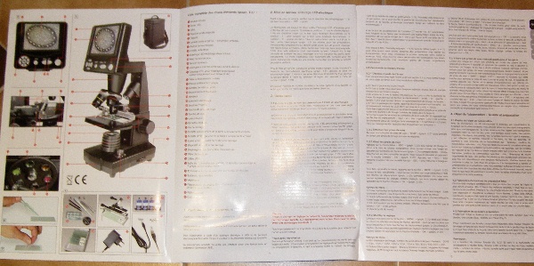 Premières impressions : Le microscope est fourni avec une sacoche rigide en tissu plastifié avec bandouillère amovible, pratique pour le transport. A l'intérieur, sur une plaque indépendante, sont disposés des accessoires de prélèvement, un petit manuel bien fait avec exemples de préparation, un kit pour élevage d' artemias et un milieu de montage liquide (gomme) . Les lames préparés et finement colorées contiennent cellules d'oignon, tiges de bois, patte de mouche... |