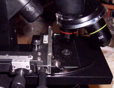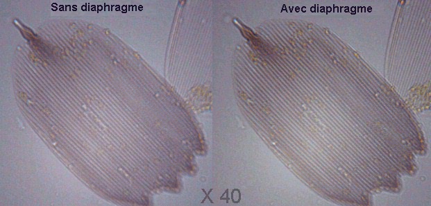 Un petit regret : L'illuminateur n'a pas de diaphragme : un diaphragme amovible (fait par moi même avec une rondelle percée d'un trou de 3 mm ) en sortie d'illuminateur améliore grandement le contraste et la profondeur de champ surtout à x 4 et x 10 , un peu moins au x 40 . |