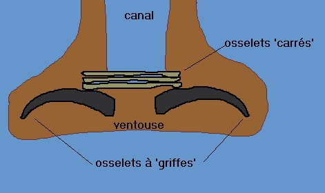 Ces quatre osselets semblent porter des griffes sur leur partie externe. (détail à droite x 15). Ils sont tenus et renforcés par une structure carrée centrale que l'on voit bien sur la vue de gauche. Celle ci est séparée du reste dans l'image ci dessous (mais les os ne sont pas cassés, il s'agit de 3 couches de 'feuilles' indépendantes) et le dessin donne une idée de l'organisation de la ventouse d'un podia vu en coupe : |
