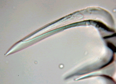 Les plus impressionnantes sont celles (globifères) qui possèdent les griffes ci dessous (x 6) (c'est celle de l'animation plus haut) : et dont le détail de la griffe indique qu'elles sont venimeuses et conçues pour injecter une substance toxique aux intrus : en effet un canal apparaît clairement dans la griffe supérieure sur la vue de droite (x 40) : |