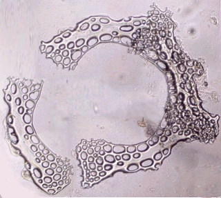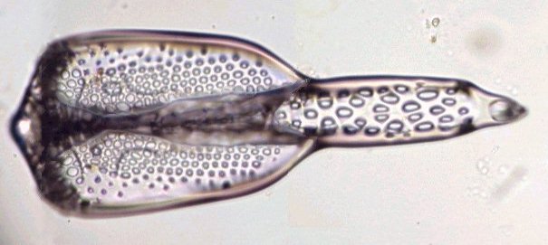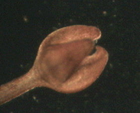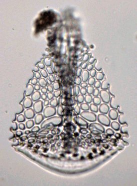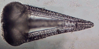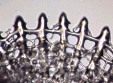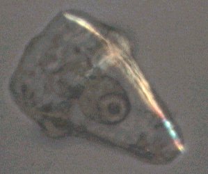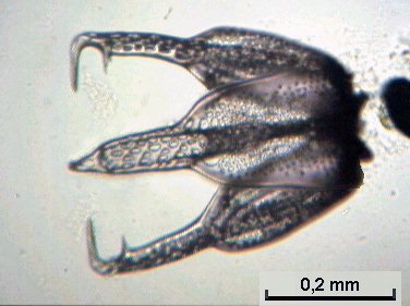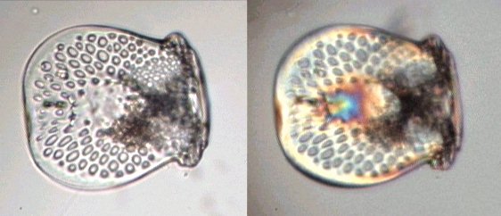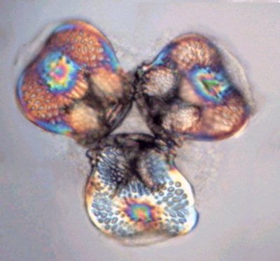 Ces pinces à trois doigts sont appelés triphylus : en voici la totalité des os en position ouverte en lumière polarisée : Comme les osselets sont formés de calcite (carbonate de calcium ) qui possède un pouvoir rotatoire sur la lumière , on peut obtenir de magnifiques images en lumière polarisée . Cela vaut aussi pour la larve : (le champ de la larve pluteus de droite ou l'on voit les barres de calcaire est un peu sombre car ma caméra est insuffisamment sensible pour rendre toute la beauté du spectacle ) . |