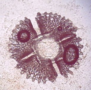 Comment obtenir des pedicellaires ? inutile d'essayer avec une pince à épiler : elles sont quasiment invisibles au milieu des piquants ! J'utilise la méthode suivante : je place l'oursin vivant que je viens de pécher (je n'ai pas essayé avec des oursins vendus dans le commerce, ) dans un bol avec de l'eau de mer, le coté oral ( la bouche) en haut et je dirige aux alentours de celle ci un fort jet d'eau (obtenu avec une seringue de 50cc). Je recommence deux ou trois fois l'opération en utilisant l'eau du bol pour remplir la seringue, je rend l'oursin à son environnement et je laisse décanter le bol. Les pédicellaires tombent au fond et si vous êtres chanceux (le bol... encore !..) peut être aussi quelques œufs que l'oursin aura laissé échappé dans son émotion. (Ce sont ces œufs, de couleur rouge orangé que les amateurs d'oursin mangent à la petite cuillère...) . Que les âmes sensibles se rassurent, l'oursin va rapidement reconstituer ses pédicellaires cassées comme tous les échinodermes qui ont une faculté de régénération surprenante, l'étoile de mer étant par exemple capable de régénérer en totalité un de ses bras . |