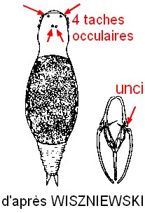 Unci en aiguille, éloignés des pointes des rami.4 taches occulaires incolores