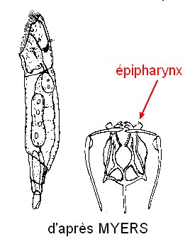 Orteils larges, courts, avec des bouts émoussés, rognés. Bord intérieur supérieur du rami avec de petites dents émoussées. Epipharynx en forme de foliole, denté à l'intérieur |