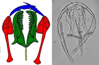 Mastax forcipé donc avec rami en forme de pince sans apophyse basale qui peut être propulsé hors de la bouche. |