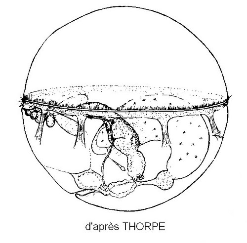 Silhouette sphérique. Champ apical fortement ondulé. Vittelarium en ruban ou en faucille avec de nombreux noyaux |