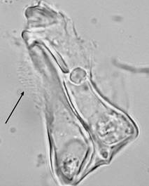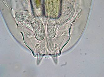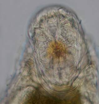 Comme beaucoup de Notommata celui-ci présente une plaque buccale ventrale au milieu de laquelle on voit une ouverture qui correspond à la bouche. |