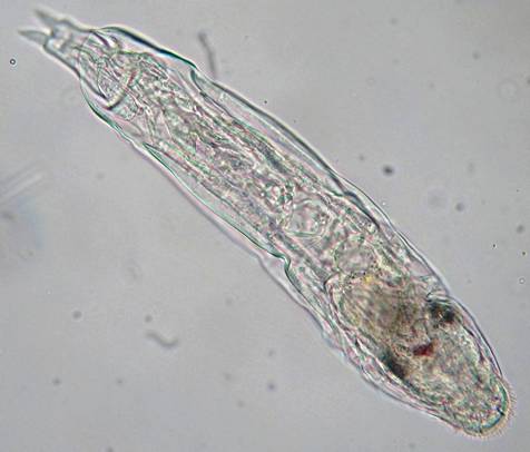 Après essorage de ces plantes dans un tube, de retour à la maison j'ai pu observer des rotifères assez imposants en taille ( proches de 0.7mm) que j'ai pris au départ pour des Notommata copeus (voir sur le forum) |