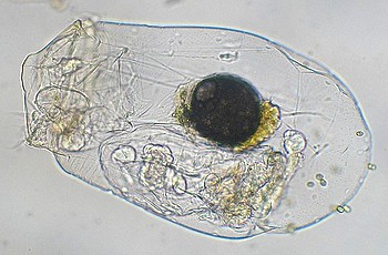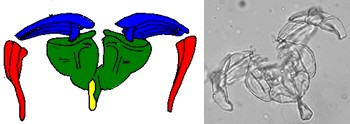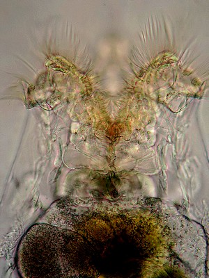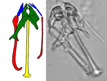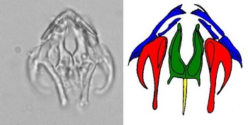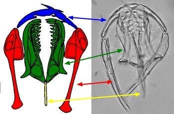 | ainsi que les Asplanchnidae à mastax incudé , çi dessous le contenu de l'estomac de Asplancha brightwelli :4 lecanes + 3 autres trophi |
