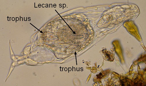 | La spécificité alimentaire des rotifères est plus ou moins marquée selon les espèces, la variété étant fonction des types de mastax et de couronne ciliaire. Les Rotifères sont ainsi microphages, ils se nourrissent alors de Bactéries, d'Algues, de détritus . |