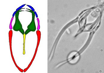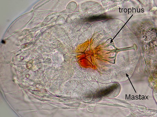 | Le mastax est un muscle qui renferme des pièces dures: le trophus qui permet de broyer les aliments avant leur passage dans l'estomac.Il peut être pour certain propulsible pour attraper les proies. |