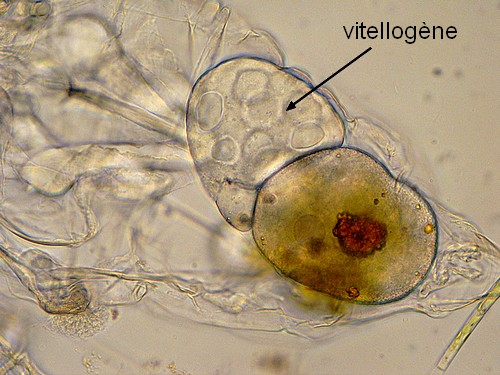| La vessie reçoit deux cordons néphridiens latéraux et se déverse dans le cloaque, Le système reproducteur comporte la gonade impaire, masquée par une énorme glande plurinucléée qui synthétise le vitellus des œufs : le vitellogène, caractérisé par de gros noyaux en nombre généralement fixe pour une espèce. L'oviducte aboutit également au cloaque qui débouche dorsalement au pied. |