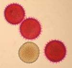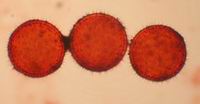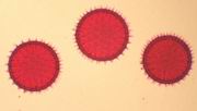 haies)De gauche à droite : fig. 1 : pollen de Vipérine, coloré à la safranine fig. 2 : pollen de Liseron des haies, coloré à la safranine fig. 3 : pollen de Rose trémière, coloré à la Fuchsine de Ziehl De gauche à droite : fig. 1 : pollen de Rose trémière, coloré au vert d'iode fig. 2 : pollen de Rose trémière, coloré à la Phloxine B alcoolique fig. 3 : pollen de Rose trémière, coloré au rouge Congo SDS De gauche à droite : fig. 1 : pollen de Rose trémière, coloré au Rouge neutre fig. 2 : pollen de Rose trémière, coloré à la safranine, avec un grain non coloré |