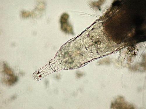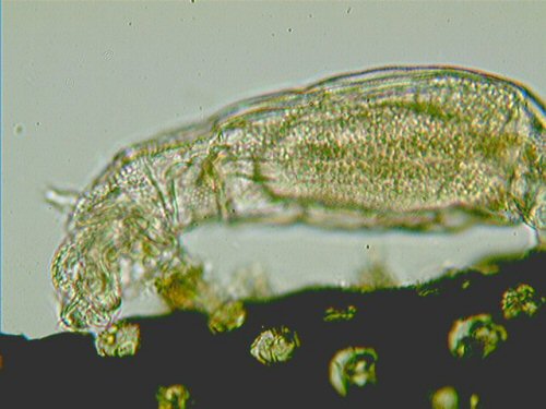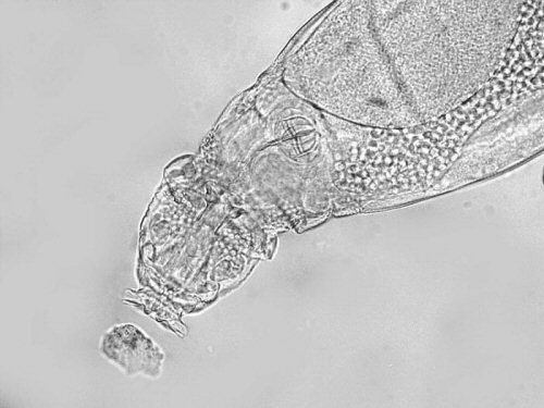 - Le second sous échantillon peut être traité avec du CO2 (en mélangeant à l'échantillon de l'eau commerciale gazéifiée) ou par l'asphyxie (récolte concentrée, dans un petit flacon complètement rempli et fermé hermétiquement) qui, pour ce matériel sensible, peut rarement produire l'anesthésie de quelques bdeloidés . Mais… il n'y a pas que des bdeloidés dans l'échantillon, et vous pourrez être enclins à faire une investigation plus complète de sa composition. |