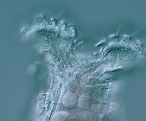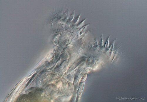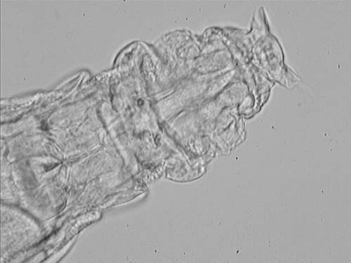 Doigts (orteils) : Nombre (mieux étudié dans une goutte pendant, avec le rotifère collé à la lamelle) et disposition. Longueur absolue et relative, entre eux et avec les éperons L’étude du pied peut demander un long temps, et beaucoup d’effort. La plus part du temps il est masqué par le détritu. |