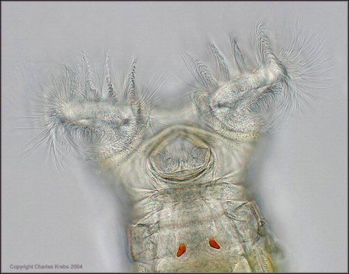 Tête et « couronne » Vérifiez la forme de la tête, sa largeur, et la forme de la « couronne », sa taille par rapport a la tête quand elle est déployée, l'ordre dans lequel s'ouvrent les trochas, la longueur de leur pédicelle, et de sa mobilité. |