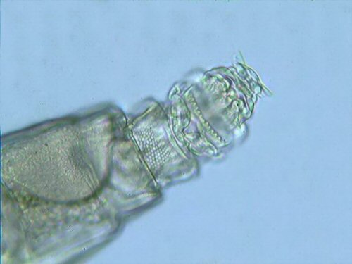 Néphridies : (40x et 100x, mieux dans des exemplaires comprimés. Peuvent ne pas être vues, chercher les cellules à flammes vibratiles) |