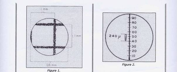 3) Il n’y a pas si longtemps, la seule méthode valable et reconnue de faire des mesures d’objets microscopiques passait par la combinaison d’un micromètre oculaire et d’une règle-objet. Le micromètre oculaire est un disque de verre sur lequel est gravé une échelle comprenant généralement 100 divisions, de valeur arbitraire. Au contraire, les dimensions de la règle –objet doivent être connues avec une grande précision. En fait, c’est une échelle de 1 ou 2 millimètres de long, dont chaque millimètre est divisé en 100 parties. Chaque division représente donc 10µm. (Vous pouvez vous imaginer ce qu’il y avait d’héroïque dans la fabrication d’un tel objet aux premiers temps de la microscopie !)