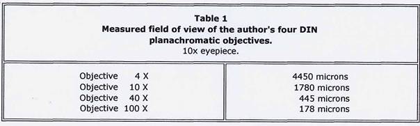 Avant tout, j’ai mesuré avec précision le champ de chacun de mes objectifs (ma confiance envers les données du constructeur étant limitée, je recherchais les erreurs). A ma grande surprise mes chiffres, à peine arrondis, confirmaient ceux gravés sur les boîtiers de chaque objectif. Dans la table 1, vous pouvez vous rendre compte que le X40, par exemple, est exactement dix fois plus puissant que le X4, et 2,5 fois plus que le X10.