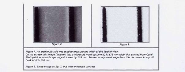 Ce début était prometteur. Ensuite, j’ai mis mon appareil en route, et pris une photo en 640X480 de la règle étalon avec chacun des objectifs. Comme celle-ci est montée verticalement sur la platine (ndt : dans l’alignement de la potence), je ne pouvais obtenir que la plus petite des dimensions du champ photographique, ce qui était tout de même suffisant.