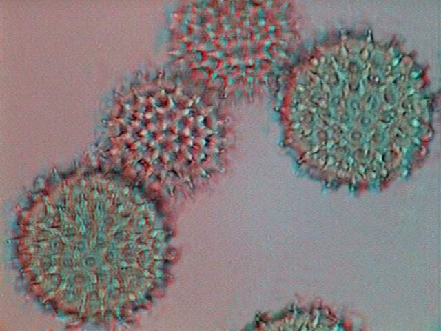 à l'écran www.microscopy-uk.org.uk/mag/art97b/wim2.html de l'ordinateur. La méthode la plus facile est de placer sur la source de lumière ou dans le porte filtre un filtre double, avec la moitié gauche rouge et la moitié droite bleue (ou verte, pour une autre technique) Il pressente dans les pages de son site des très beaux exemples. La même technique est utilisée par Giorgio Carboni. Il pressente aussi des exemples. www.funsci.com/tlc/telecamere.htm Et Daniel Nardin a fait une très complète présentation dans www.microscopies.com/DOSSIERS/Magazine/Articles/DNardin-Stereomicroscopie-1/Stereomicroscopie-1.htm Les filtres sont faciles à acheter ou même à faire soi même. On peut en faire quelque uns d'efficaces avec deux pièces de Cellophane. Ou avec la méthode des acétate colores. Faites en l'expérience. Vous avez besoin de lunettes bleu et rouge pour voir les anaglyphes. J'ai fait les miennes avec des Cellophanes collées sur une monture que je place sur mes lunettes ordinaires. Ce sera plus facile pour ceux d'entre vous qui n'ont pas besoin de lunettes. N'essayez pas les acétates, ils sont trop opaques. Les résultats sont incroyables. Et en plus de jouir les photos de Wim ou de Giorgio, ou des vôtres, vous pourrez faire un merveilleux voyage par les Alpes (Les Alpes ne sont certainement pas microscopiques)) à cette adresse. perso.wanadoo.fr/alpes-stereo/autresStereo/TDMautresStereo.htm Il y a une autre technique pour faire des photomicrographies 3D: Voyez ces épreuves que j’ai faites en utilisant deux photos de colistiers (pardonnez mois, chers amis) et deux autres personnelles. Chiquez sur les photos pour voir les originaux |