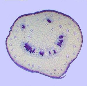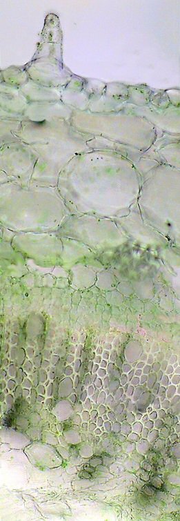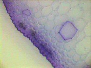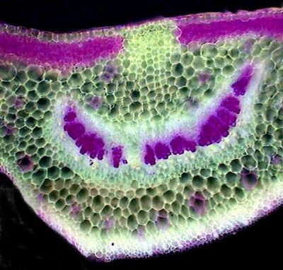 | J'ai remarqué qu'un colorant très commun et facile à se procurer est le Violet de Gentiane, un ancien désinfectant contre le "muguet" (candidose) des bébés, et d'autres infections. Ici il est vendu en solution à 1% dans l'eau. Il est très stable; 20 ml sont une quantité suffisante pour toute votre vie, parce qu'il est employé à raison d'une goutte pour 10 millilitres ou plus d'eau. Cette solution de travail est très durable, elle teint le sclérenchyme et les fibres d’un violet foncé, le xylème d'une couleur plus profonde avec une teinte rouge, et le cambium, phloème et les collenchymes d'un léger pourpre. La cuticule de l'épiderme est également fortement colorée. Comme il a déjà été question,, le bleu de méthylène peut également être employé. |
