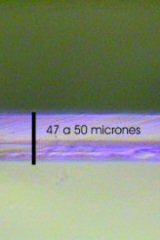 Je fais une mesure supplémentaire: la hauteur du tranchant (pas son épaisseur! ). Il avoisine les 290 microns de haut. Ainsi le bord pointu est un triangle isocèle avec une base de 100 microns, et une hauteur de 290 microns. Le tranchant est situé au milieu à 50 microns des bords de la lame. | ||