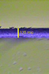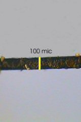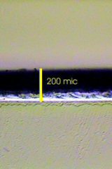 Sur la nature des séparateurs. J'ai essayé 4 genres de séparateurs. Les étiquettes auto-adhésives en papier, un ruban isolant d’électricien en plastique noir, une marque de bande adhésive en plastique clair et les lames de rasoir elles-mêmes. Pour pouvoir mesurer l'épaisseur des différents séparateurs j’ai collé des échantillons des bandes au bord d'un porte-objet, et je les ai coupé au raz avec une lame de rasoir. Je pris des photos avec les objectifs 10 x et 40 x en utilisant le disque de contraste COL-D3 qui donne une très bonne séparation optique des composants, et j’ai mesuré l'épaisseur avec l'outil de mesure calibré du programme de l'appareil photo de mon microscope. J'ai brisé en deux la lame de rasoir au niveau de sa fente et une moitié a été recoupée en forme de V. Placées debout au-dessus d'une lame de verre elle peut ainsi offrir son bord à la vue des objectifs. Les résultats sont mitigés, pas au sujet des matériaux eux mêmes, mais au sujet de l'épaisseur des matériaux coupés. |