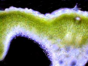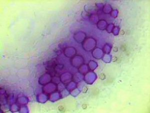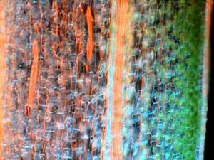 Coupes non colorées : Si vous montez vos coupes récemment faites sans n'importe lequel des médiums suivants: la glycérine ou le PVA-G vous pourrez effectuer une étude approfondie et instructive l'anatomie d'un matériel presque vivant. La glycérine et les PVA-G agissent en tant que protecteurs et même la chlorophylle peut se conserver pendant de nombreux jours sans altération. Tous les tissus végétaux sont facilement reconnaissables par leurs traits morphologiques, et leurs arrangements dans les organes étudiés qui sont très caractéristiques. Vous pouvez découvrir les idioblastes avec leurs cristaux sécrétés, voir même le noyau de beaucoup de cellules, et les plastides, comme les huiles et l'amidon, inclus. Si vous ajoutez à la glycérine une mince quantité d'iode, l'amidon sera coloré en bleu et vous pouvez facilement découvrir les zones de production de l'amidon . Tout ceci se perd si vous videz les cellules de leur contenu avec de l'hypochlorite. Note : n'essayez pas d'ajouter de l'iode aux coupes faites à partir de matériaux récemment exposés à de fortes lumières ; vous risquez d'avoir un spécimen presque tout bleu et illisible. ( tout au moins à Cancún) Utilisation du four à Micro-ondes : Le montage au glycérol, ou même dans PVA-G peut exercer sur les cellules vivantes une pression osmotique excessive. Les matériaux sensibles, comme les algues, les poils tendres, les cellules d'épithélium, les hyphes des champignons et les fruits, et ainsi de suite, peuvent s'effondrer. Vous pouvez naturellement employer quelques fixateurs et des routines de déshydratation pour un montage plus prolongé en glycérine. Mais une technique rapide et utile est de mettre les matériaux ou les coupes, rassemblés dans une petite boîte de Pétri, ou même les préparations récemment faites, sur le plateau tournant du four à micro-ondes pendant une durée de 12 à 20 secondes à 100% de puissance. Ceci augmente la vitesse d'infiltration des média de montage, évapore l'eau, éliminant les bulles d'air, et en plus les cellules deviennent turgides. Expérimentez les meilleurs temps avec votre propre four. Le mien est un 700w. Vous pouvez faire des calculs à la règle de trois pour votre propre fourneau.