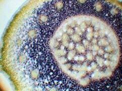 Les meilleurs Rheinberg sont ceux qui ont le centré bleu (diamètre de 12-15 millimètre) ou noir avec la couronne extérieure dans différentes teintes de jaune ou d'orange. Une modification utile quelquefois est un disque avec un premier anneau clair de 2 millimètres de large, un anneau rouge de 3 millimètres de large, clair de 2 millimètres, bleu de 2 millimètres et un centre noir de 12 millimètres de diamètre. Centré ou quelque peu déplacé, il donne beaucoup de nuances utiles. Un autre Rheinberg remarquable est le Rheinberg avec Quadrants (RhQ). Le centre de ce filtre est noir, et sa couronne est composée de quadrants alternativement rouges et bleus. Confronté à des sujets avec des fibres transversales et longitudinales il colore le unes en rouge et les autres en bleu (avec toutes les situations intermédiaires que vous pouvez imaginer) Les coupes végétales avec de grandes cellules sont idéales pour montrer son efficacité. Les filtres « Simulateurs de Nomarsky » originaux de Wim van Egmont sont des disques noirs, avec un croissant transparent marginal et un centre bleu ou pourpre circulaire. Ils sont une combinaison de Fond Noir, de Rheinberg et d' éclairage oblique, et donnent leurs meilleurs résultats avec les objets discrets comme les fibres, les spicules, le sable et assimilés, particulièrement s'ils sont d’indices de réfraction élevés. Je remplace les disques noirs par des colorés (en bleus profonds ou rouges profonds par exemple) et rends les centres d'un diamètre semblables au disque de Fond Noir pour l'objectif utilisé, dans une couleur contrastante. Je laisse inchangé le croissant transparent. Il donne ses meilleures performances avec des coupes relativement épaisses. Les disques de contraste (Fond Noir, Rheinberg et Simulateurs de Nomarsky) permettent une très fine différentiation optique des différents tissus, dans les coupes minces et moyennes, imitant les coupes colorées, et quelquefois les dépassant nettement. Ils sont vraiment très utiles (pour le 4x et le 10x et avec quelques limitations à partir des objectifs 40x) pour donner de la variété et gaieté aux photographies de coupes. La résolution en souffre en peu avec le 40x. Quoi qu'il en soit, la différence entre une coupe brillamment colorée et un gris opaque est vraiment exceptionnelle. |