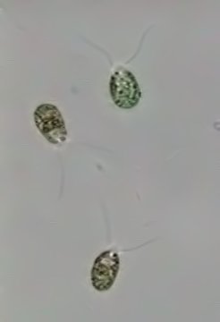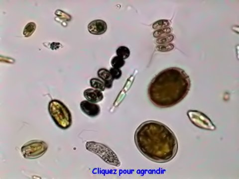 sp. (front et profil) les flagelles ne sont pas visibles. b- Cryptomonas sp. c- Chromulina sp. d- une espèce de Scenedesmus sans épines, avec de l'amidon fortement coloré par l'iode. e-un petit flagellé de genre et espèce inconnus de la famille Astacidae f- un Trachelomonas sp. à thèque lisse. g- un autre à thèque parsemée d'épines. h- une espèce de Scenedesmus avec les cellules extrêmes pourvues de cornes. |